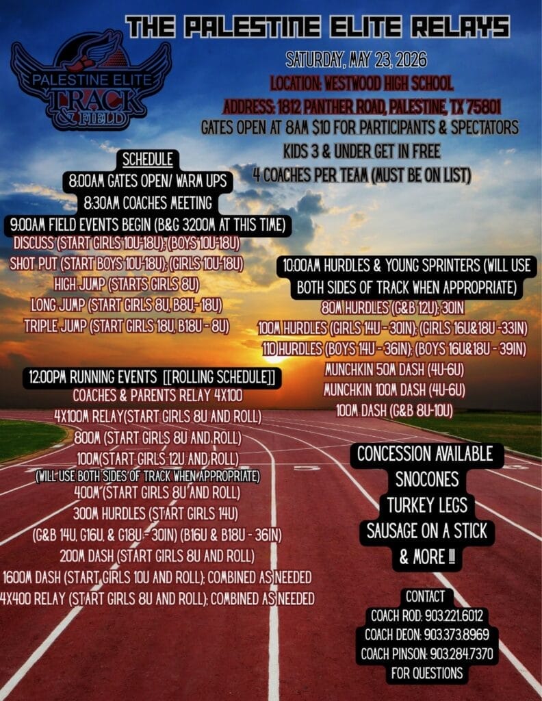 fri17jul4:03 pmfri9:03 pm “Jet Runners Friday Night Relays” @ Loins Stadium4:03 pm - 9:03 pm(GMT-05:00) Loins Stadium, Lion St, Henderson, TX 75654